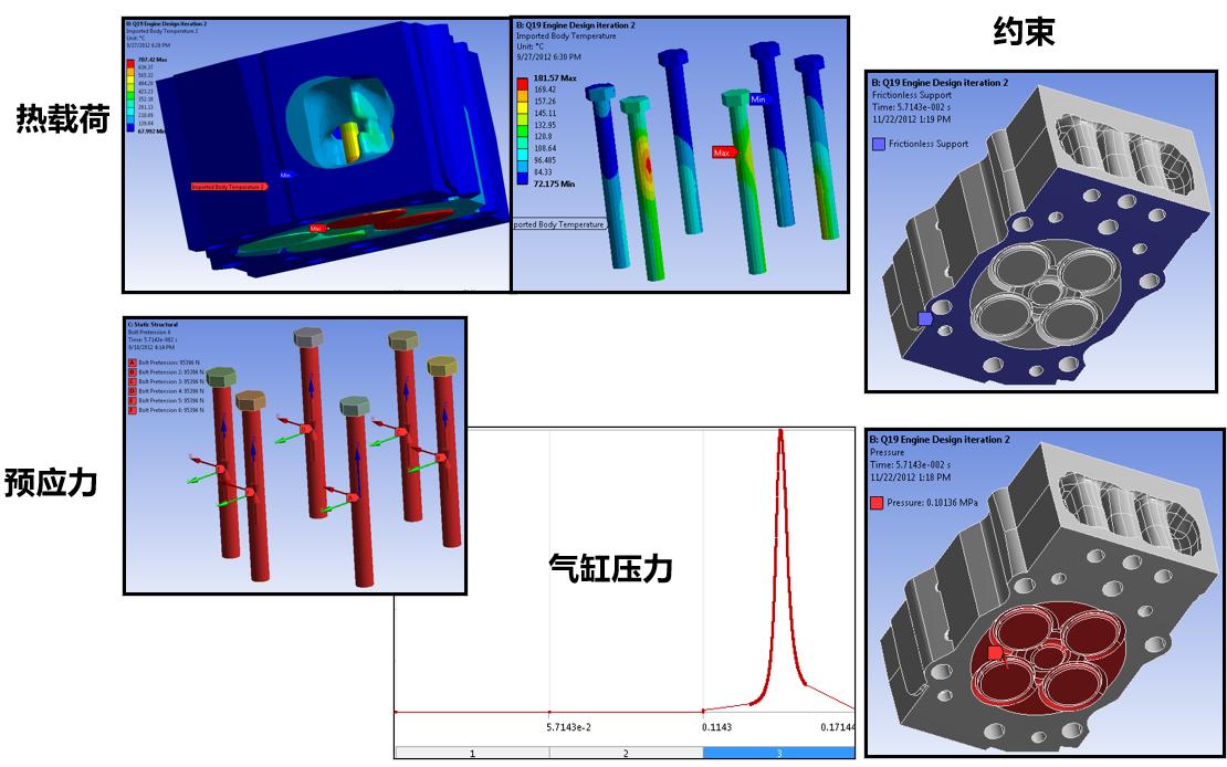 · 零件/連接件強度分析 以轎車發動機缸蓋螺栓為研究對象,通過使用軟件Ansys mechanical static structural分析了其在不同工況下的應力分布。