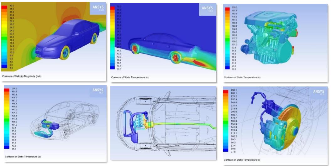 · 整車熱管理分析 以轎車造型和動力總成為研究對象,通過使用軟件Ansys Fluent建立了發動機熱管理系統模型,模擬出整車的溫度分布。