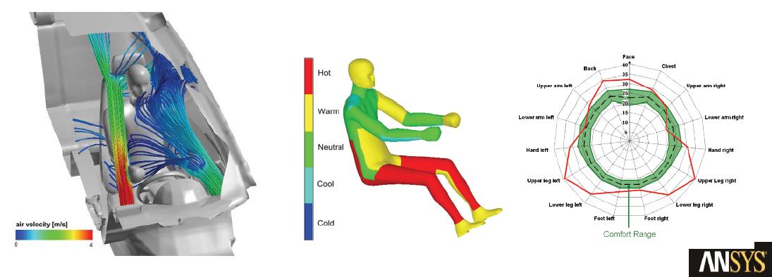 · 乘員艙舒適性 以轎車造型和內飾為研究對象,通過使用軟件Ansys Fluent分析規定工況下的降溫采暖性能能否滿足要求,改善乘員艙的溫度分布。