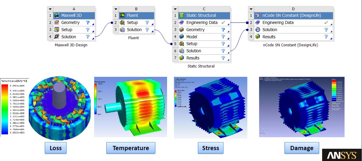 · 電機電磁-熱-結構多學科仿真分析 本文以某電機為分析對象,通過使用 Ansys workbench平臺,綜合了基于Maxwell 3D電磁分析、fluent流體分析、Static structural熱變形分析和nCode desisgnlife疲勞耐久壽命的多物理場仿真。
