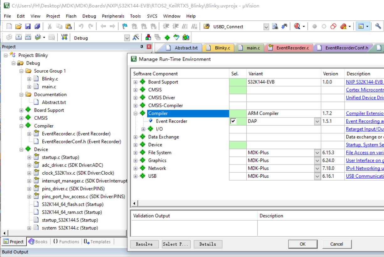 在MDK中進行 Run-Time Enviroment 設置的時候發現Event Recorder DAP 是灰色的,如圖 1 所示。工程欄中 Compiler 也是灰色。
