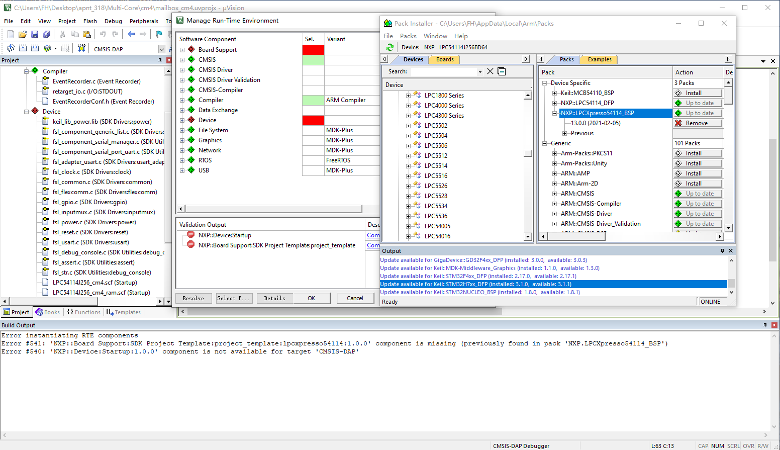在MDK中使用舊的工程時,例如老的項目需要維護。一些老的器件包有變化,更新為最新器件包。這時候會有一些報錯產生:Error #540: 'NXP::Device:Startup:1.0.0' component is not available for target 'CMSIS-DAP'