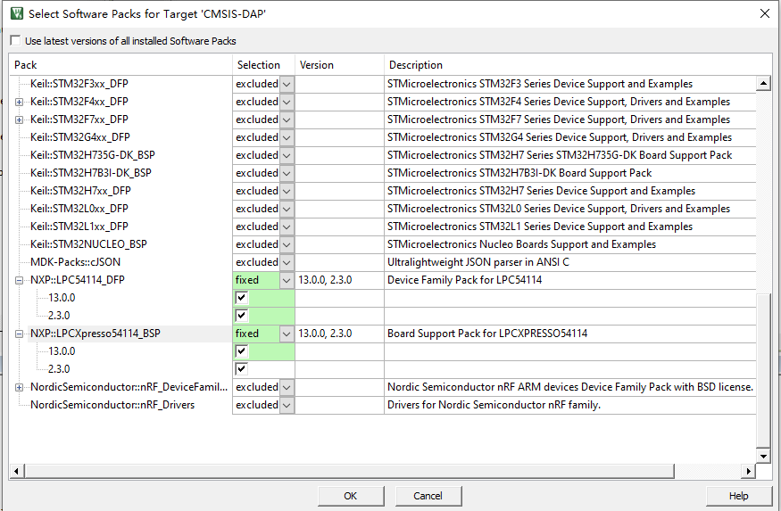 2? 在“Selsct Software Pack for Target '....'”中找到本次工程的相關器件,勾選所有版本器件包。