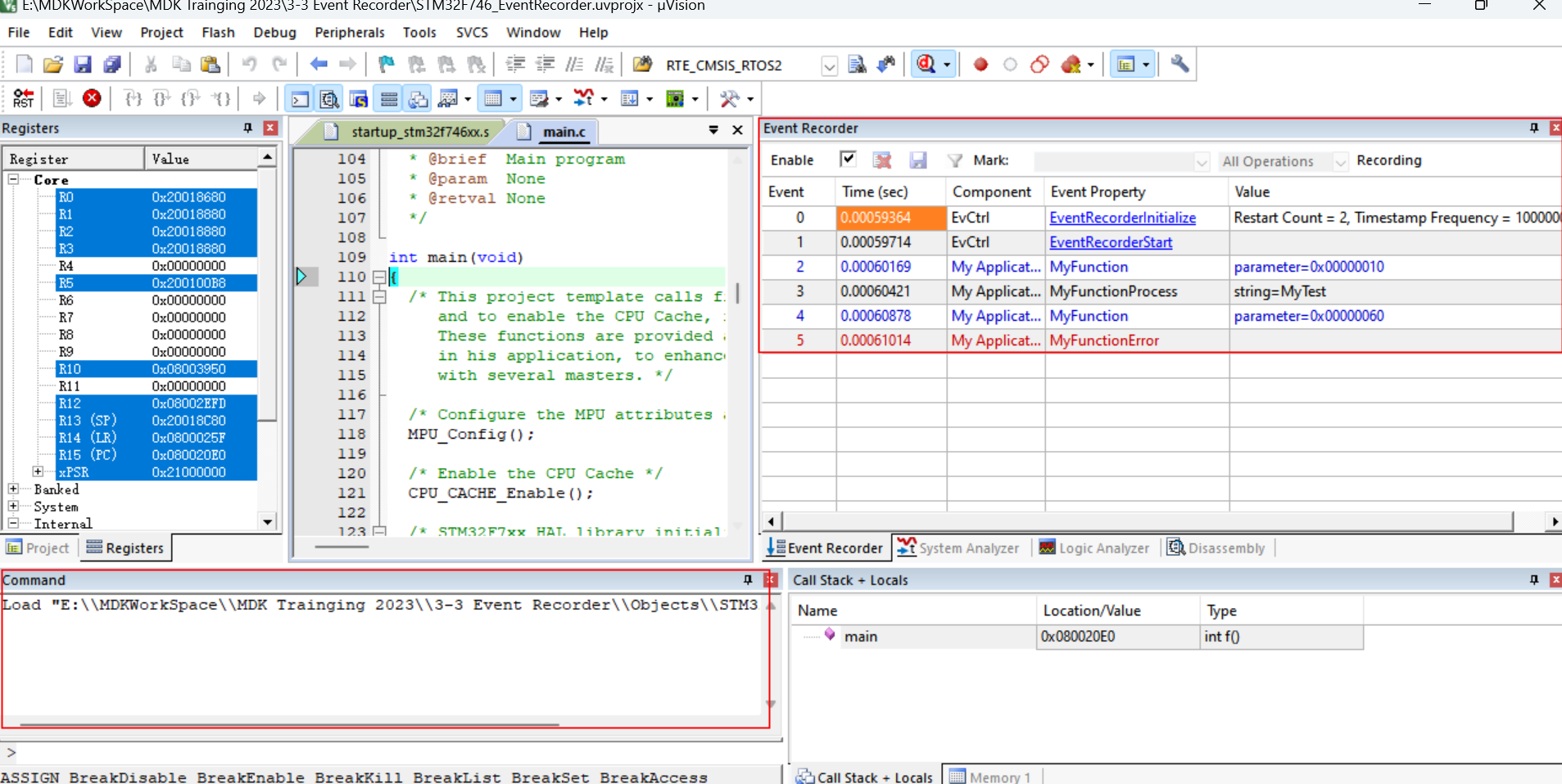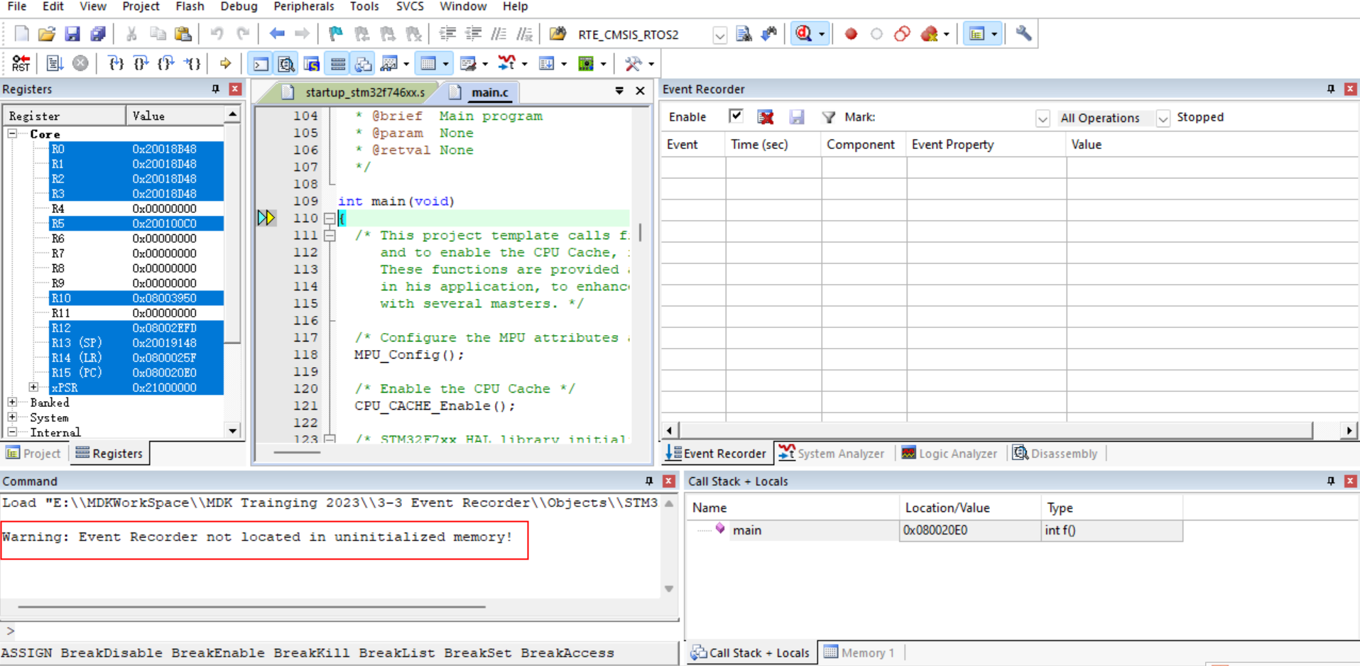 4)重新編工程,再進(jìn)入調(diào)試模式,則已沒有“Warning: Event Recorder not located in uninitialized memory!”警告信息,如圖4-4所示: