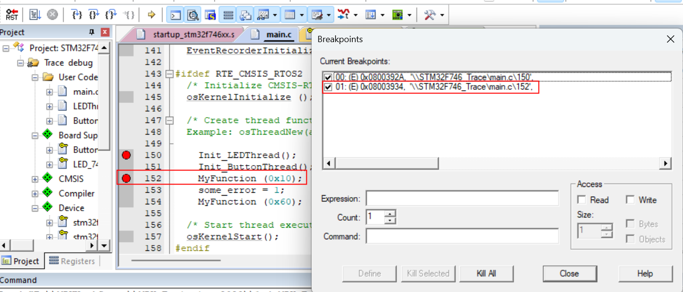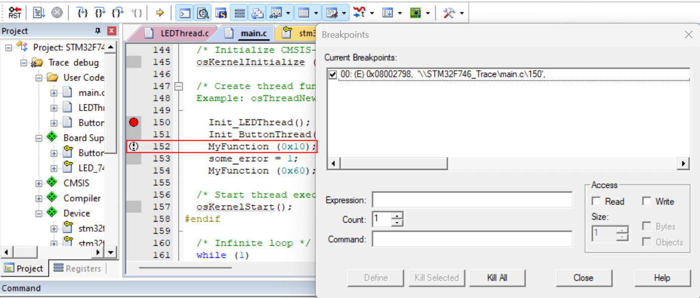 在Keil MDK的工程調試時,在有些有效的語句前,無法設置斷點,如圖2-1所示:
