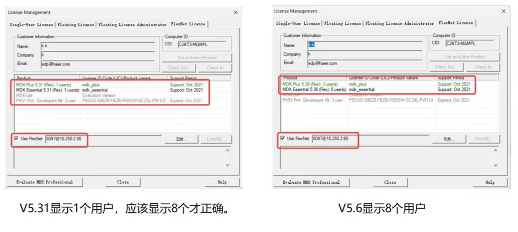 海爾的水聯(lián)網中有MDK5.31與MDK5.36,服務器有8個License可用。當客戶端的MDK5.31版的用戶去獲取License時,只顯示PLUS與ES各1個,而MDK5.36版顯示正常,如圖2-1所示: