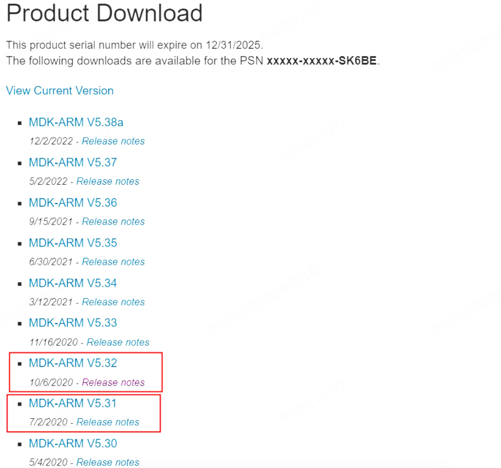 2)、從Keil MDK的下載列表中,MDK5.32與MDK5.31只差幾個月,如圖4-2所示:
