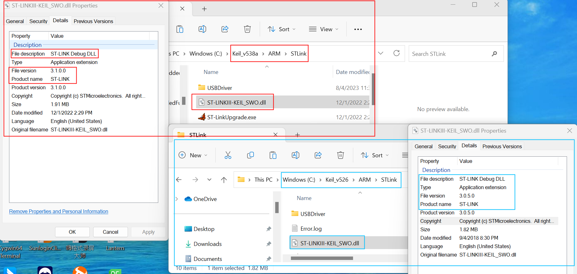 1)、打開Keil MDK5.38a與Keil MDK 5.26關于St-Link仿真器的目錄,查看“ ST-LINKIII-KEIL_SWO.dll ”的屬性,會發現這兩個不同目錄下的文件的版本不一樣,如圖4-1所示: