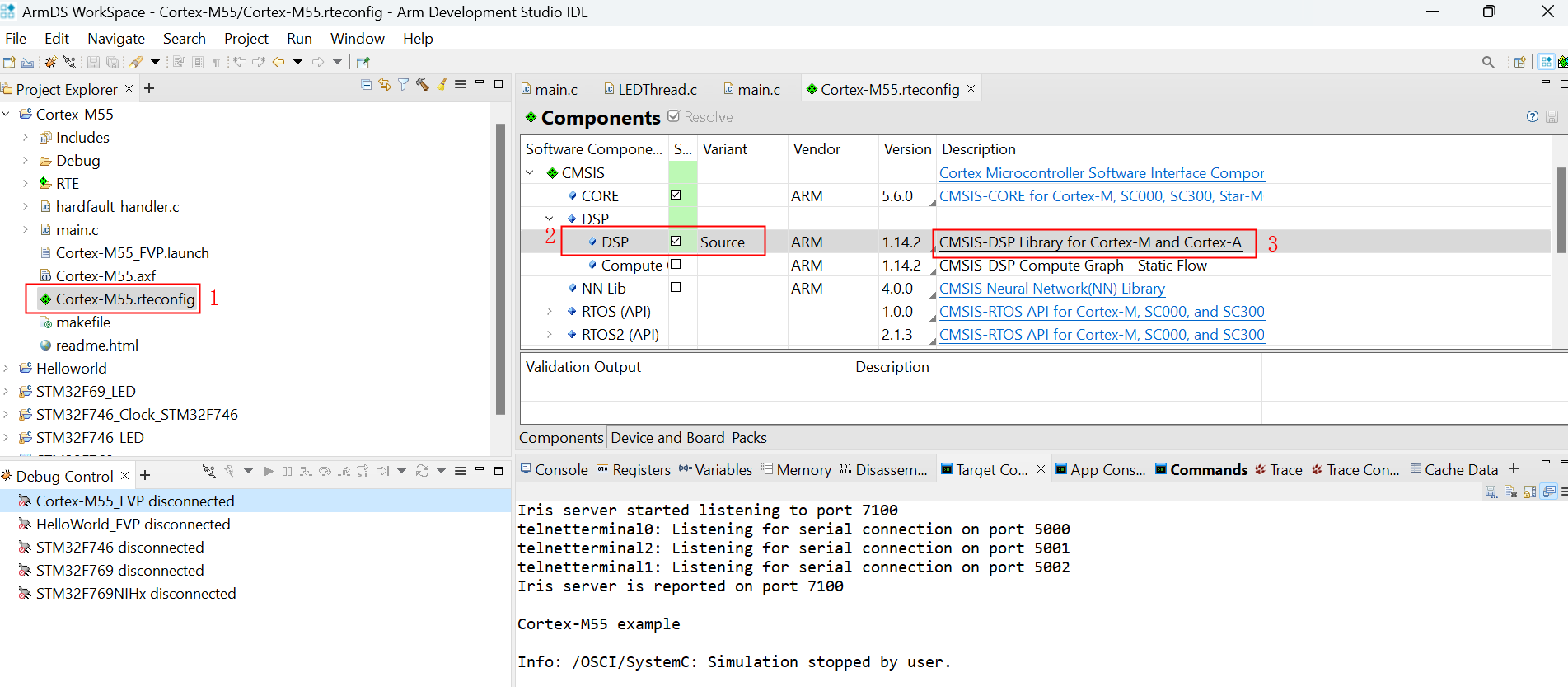 1)、打開ArmDS軟件自帶的Coretex-M55的實例中的“Coretex-M55.rteconfig”文件,選擇“DSP”如圖4-1所示: