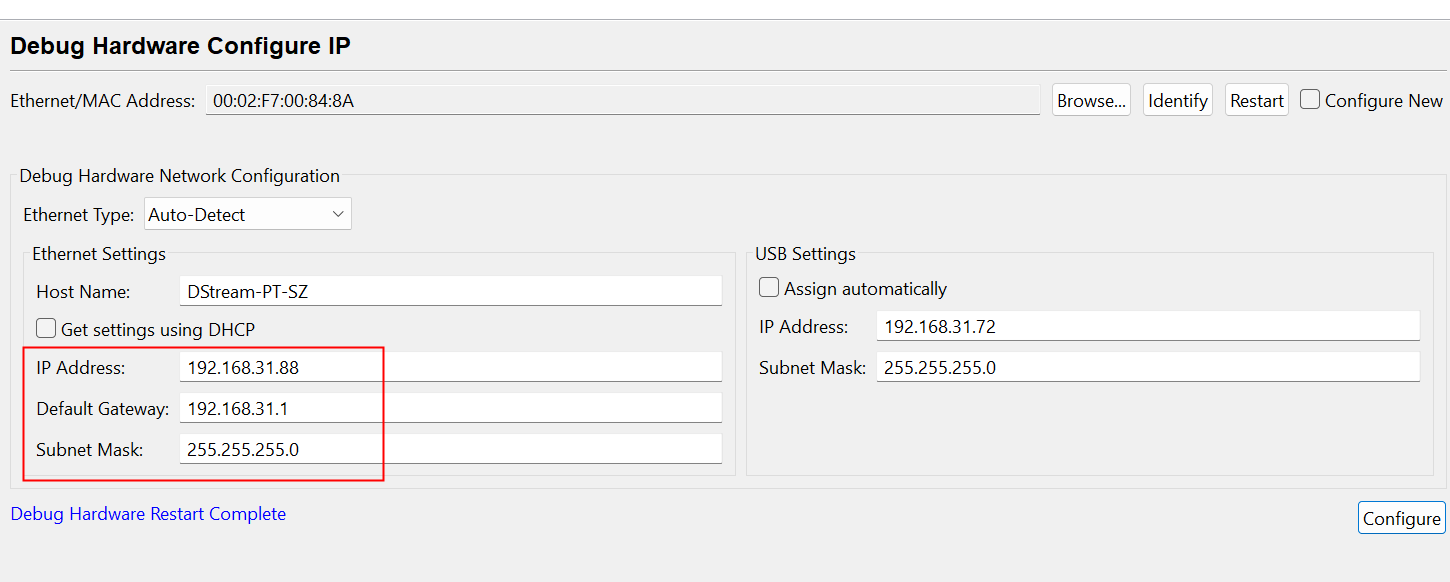 3)、在IP的配置過(guò)程中,“Status”提示燈會(huì)閃爍,配置完成后重新啟一下仿真器,固定IP已設(shè)置好,如圖4-3所示: