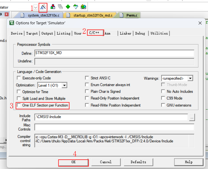 首先點擊圖4-2-1標記1處快捷方式,進入 Options for Target 目標窗口- ,并選擇C/C++(AC6)。uVision中,可以根據如圖4-2-1的標記 3 取消One ELF Section per Function的選擇,編譯后無報錯。