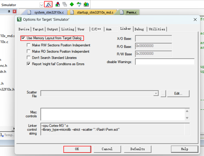 注:如果您在uVision的目標鏈接器對話框選項中選擇了目標對話框中的“ Use Memory Layout from Target Dialog ”選項,μVision將為您生成分散文件。在這種情況下,您需要禁用此選項并手動編輯已經創建的散射文件。