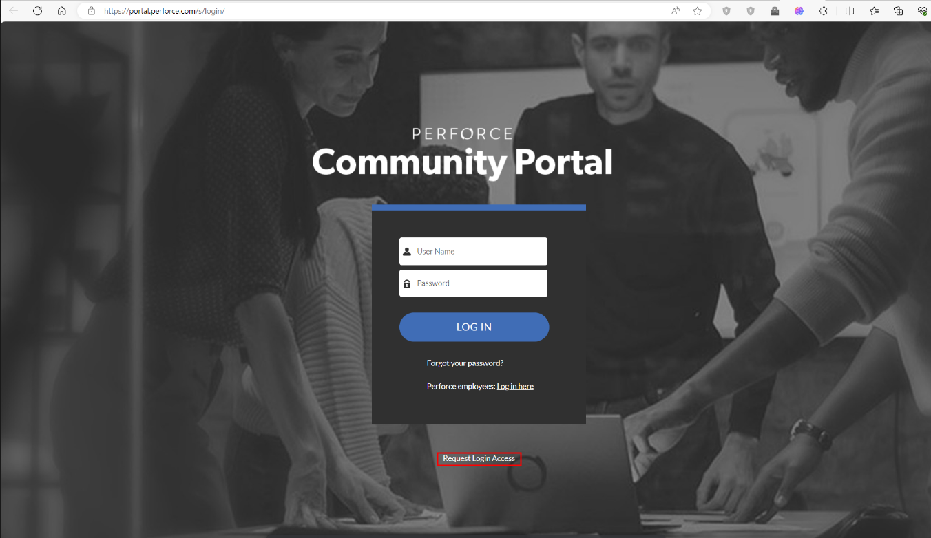 1、進(jìn)入原廠支持社區(qū):Login (perforce.com),點(diǎn)擊“Request Login Access”進(jìn)行Perfoce賬戶的注冊(cè)。