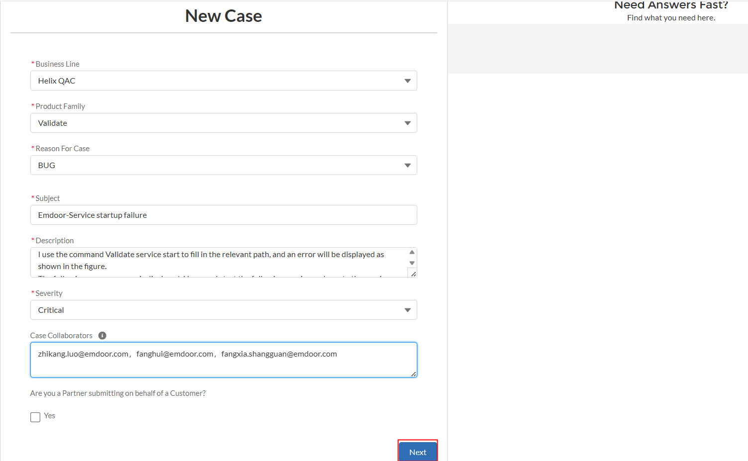 7.填寫(xiě)問(wèn)題的產(chǎn)品線、產(chǎn)品類(lèi)別、原因、主題、描述信息、嚴(yán)重性、需要抄送的郵箱和我們是否為客戶提交。填寫(xiě)完畢后點(diǎn)擊”Next“