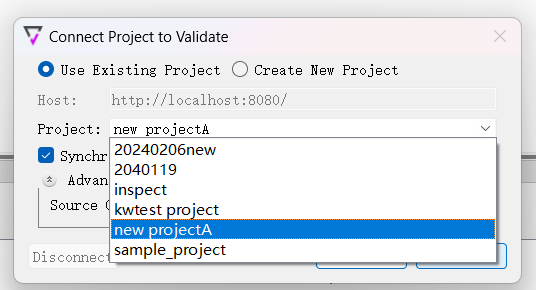 5、在彈出的Connect Project to Validate窗口選擇Use Existing Project,Project輸入項(xiàng)目名,勾選同步,點(diǎn)擊“Connect”;
