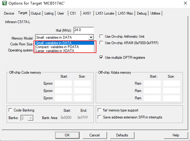 (3)、“Large : variables in XDATA:”:在Large模型中,默認情況下,所有變量都駐留在外部數據內存中(最高可達64K字節)。這與使用xdata內存類型說明符顯式聲明它們是一樣的。數據指針(DPTR)用于外部內存尋址。需要注意的是,通過數據指針訪問內存的效率很低,而且速度很慢,特別是對于兩個或兩個以上字節長的變量。這種類型的數據訪問機制比small model或compact model生成更多的代碼。