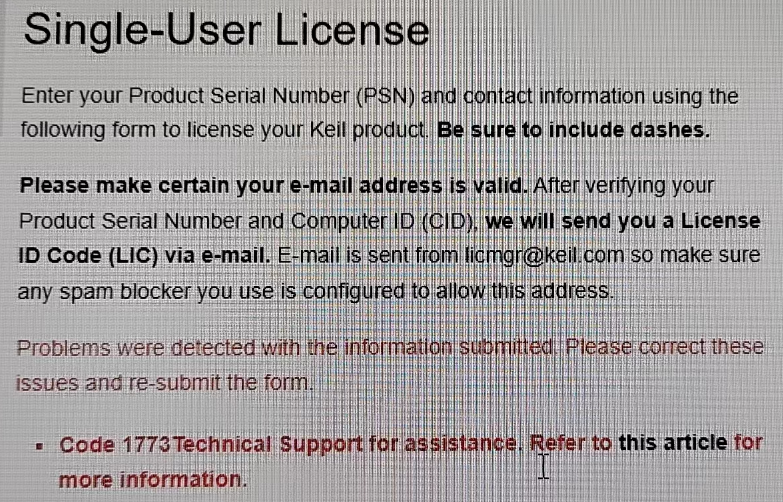 僅支持使用兩個郵箱進行提交獲取 LIC 碼,第三個郵箱進行提交后會出現以下報錯,需向 ARM 原廠提交 CASE 進行解決。