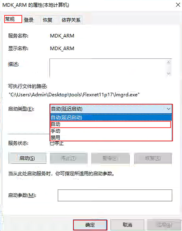 注:客戶服務器端開機未自啟動,檢查3.2處已勾選,在服務器端找到創建的MDK服務,右鍵進入服務屬性后點擊“常規”,在目標欄內找到啟動類型,選擇“自動”后,點擊確定再次重啟服務器,服務會自動啟動。
