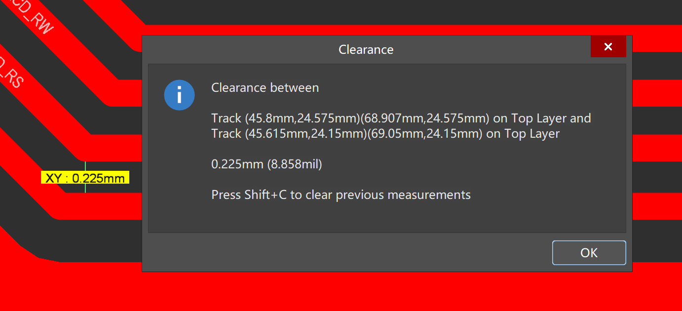 測量選中對象邊緣到邊緣的距離,圖4為測量焊盤到焊盤的邊緣距離,圖5為測量線到線的邊緣距離。