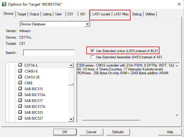 1)、在Options->Device窗口中,可以找到“Use Extended Linker (LX51) instead of BL51”的勾選項(xiàng)。選擇后,鏈接器的使用選項(xiàng)就會(huì)變成LX51(如圖4-1)。