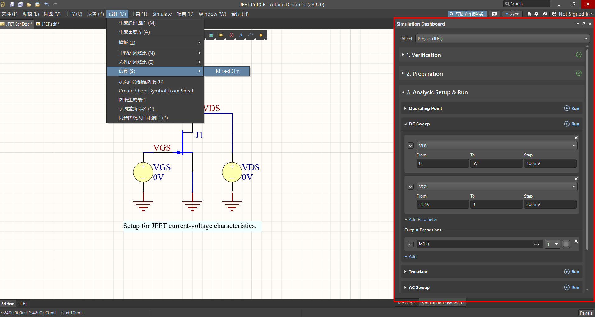改版后軟件打開仿真功能為屬性面板形式,在屬性面板中會有一個仿真驗證過程,第一步檢查元器件是否有仿真模型;第二步檢查電路激勵;第三步選擇仿真模式進行設置,對應的仿真模式【Run】即可運行。