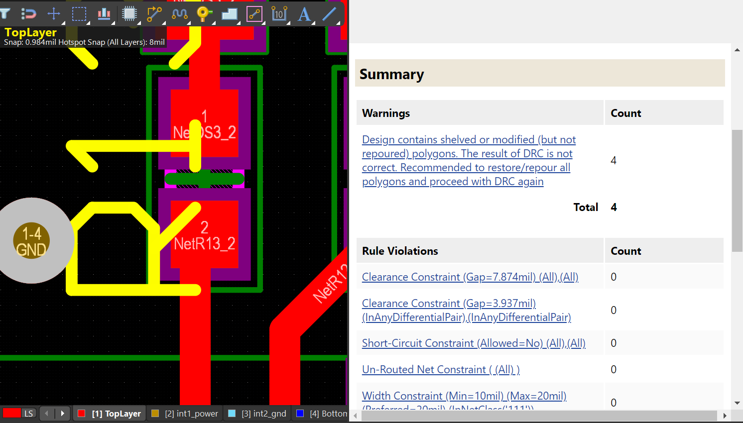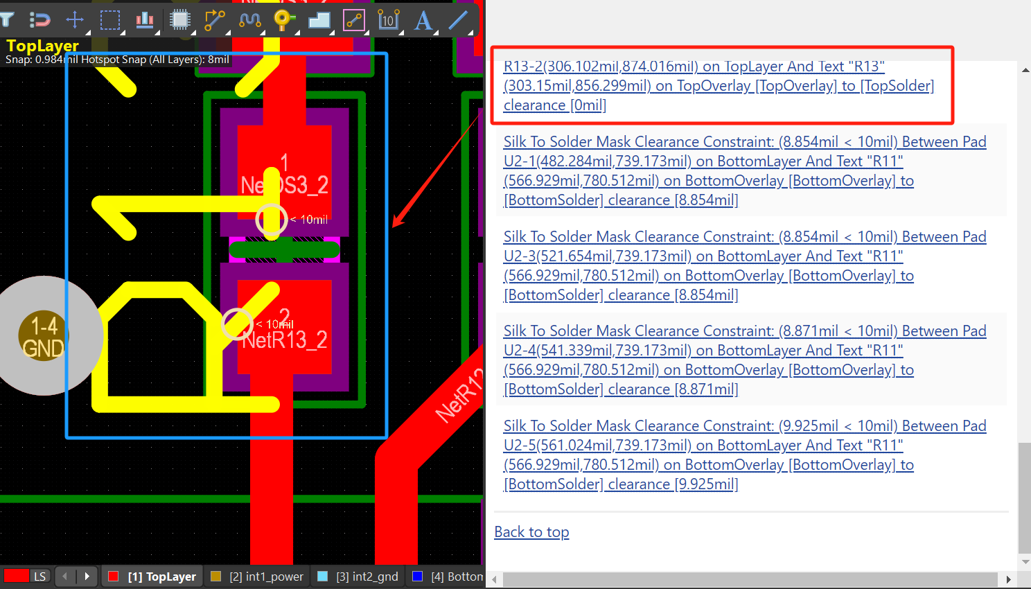 報錯提示當(dāng)前字符R13距離阻焊為0mil,小于規(guī)則設(shè)定的10mil,然后就可以根據(jù)報錯信息修改PCB了(如圖3)