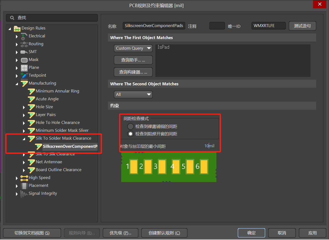 在AD規(guī)則里設(shè)置絲印到阻焊的間距,解決設(shè)計中絲印蓋到阻焊時運行DRC不會報錯的問題,并分析絲印重疊對阻焊的影響