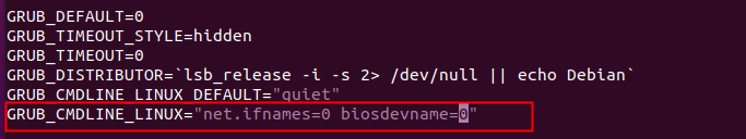 (3)、然后,修改grub文件,找到GRUB_CMDLINE_LINUX(如圖4-2-3-1),將GRUB_CMDLINE_LINUX的值改成"net.ifnames=0 biosdevname=0",如圖4-2-3-2所示: