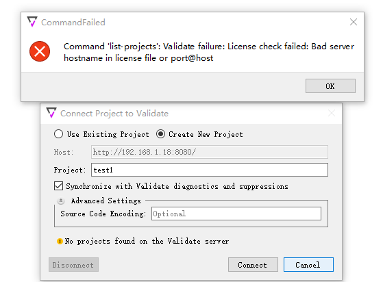 在QAC的圖形化界面中連接Validate創(chuàng)建View工程,出現(xiàn)報(bào)錯(cuò) ?“Command 'ist-projects’: Validate failure: license check failed: Bad serverhostname in license file or?port@host”