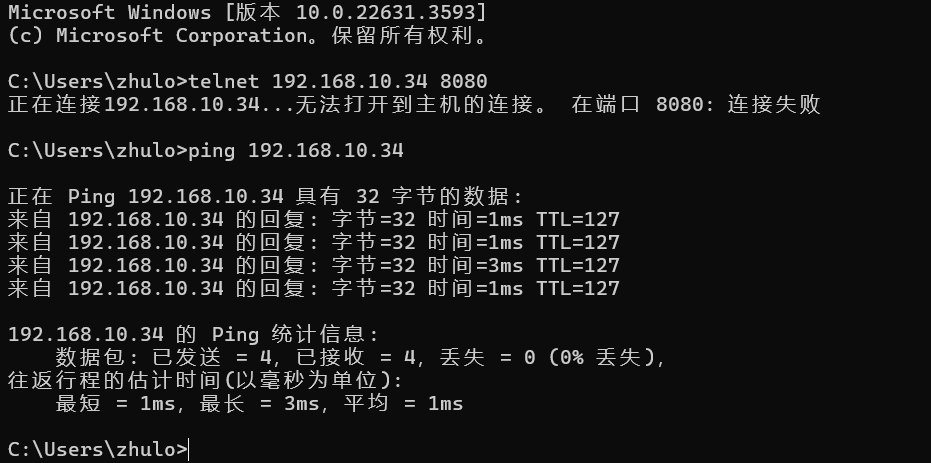 服務(wù)器機(jī)器telnet 192.168.10.34 8080沒有權(quán)限,可以ping通,有正常的網(wǎng)絡(luò)連接。