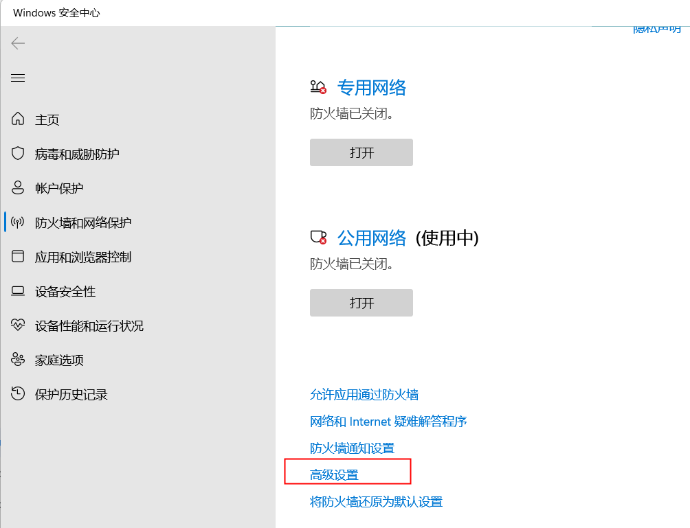 1)、在客戶端機(jī)器上打開“防火墻和網(wǎng)絡(luò)保護(hù)設(shè)置”、點(diǎn)擊“高級(jí)設(shè)置”。
