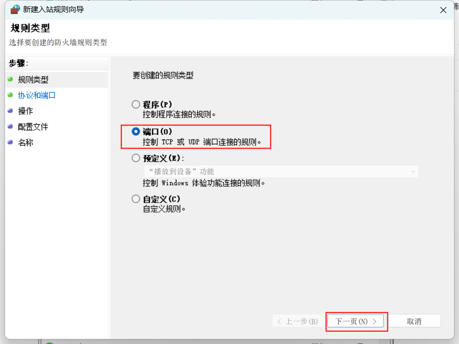 3)、進(jìn)入“新建入站規(guī)則向?qū)А薄⑦x擇“端口(o)”、再點(diǎn)擊“下一頁(N)”