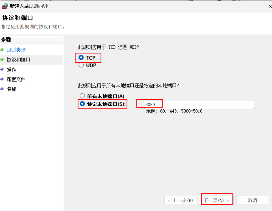 4)、選擇“TCP” 、再選擇“特定本地端口(S)”、輸入Validate特定端口“8080”,再點(diǎn)擊“下一頁(N)”