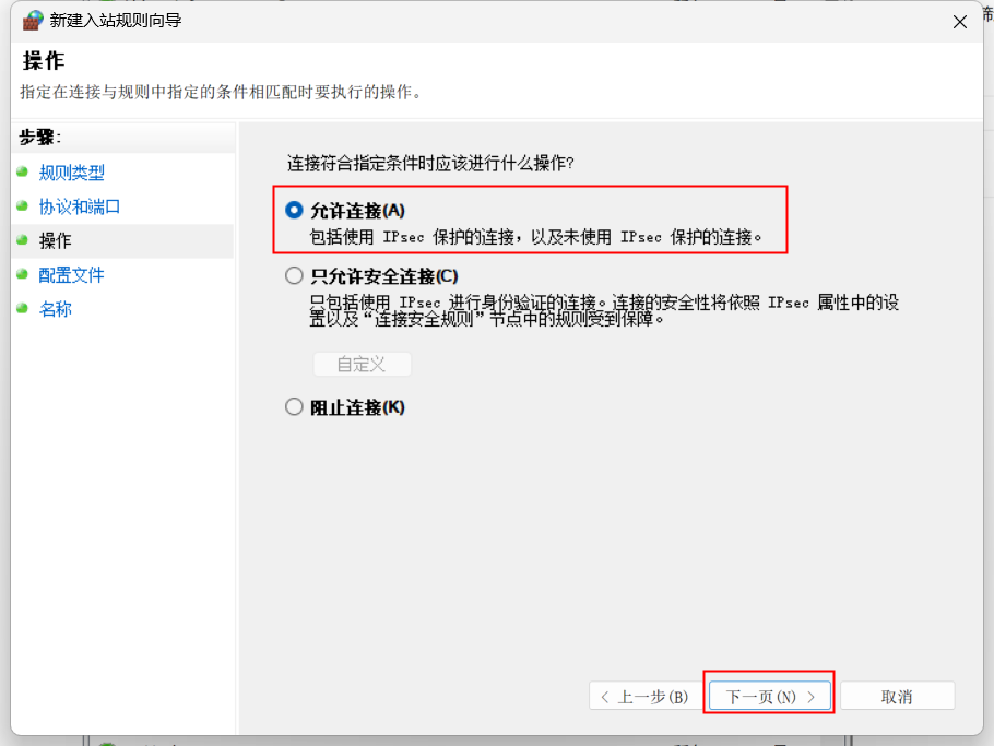 5)、選擇“允許連接(A)”再點(diǎn)擊"下一頁(N)"。