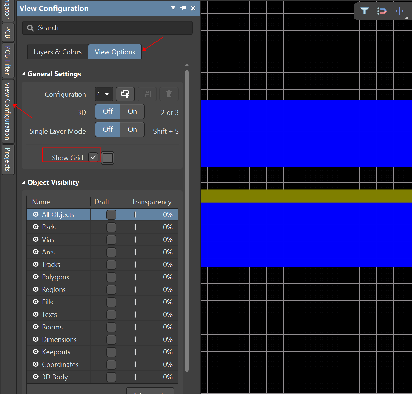 PCB設(shè)計中,可以對柵格進行設(shè)置大小,用以輔助布局布線。有時候因為誤操作會把柵格隱藏,或者拿到別人做的PCB文件進行修改,原設(shè)計人員將柵格隱藏了,又不知道怎么設(shè)置才能顯示柵格;