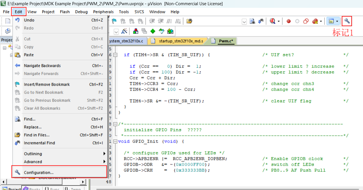 1)、在菜單欄選擇 Edit<——Configuration或者點擊標記1處的快截方式,即可進入目標欄。