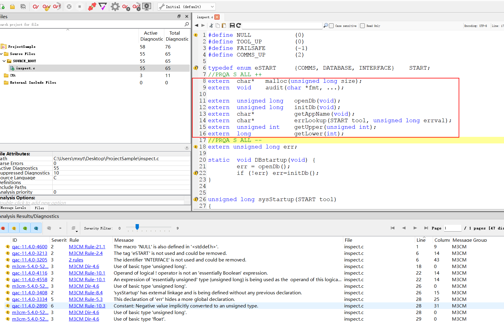 2、在不想參加掃描的源碼開始和結尾處添加注釋“ //PRQA S ALL ++”和“ //PRQA S ALL --”,保存,點擊分析按鈕重新掃描項目;