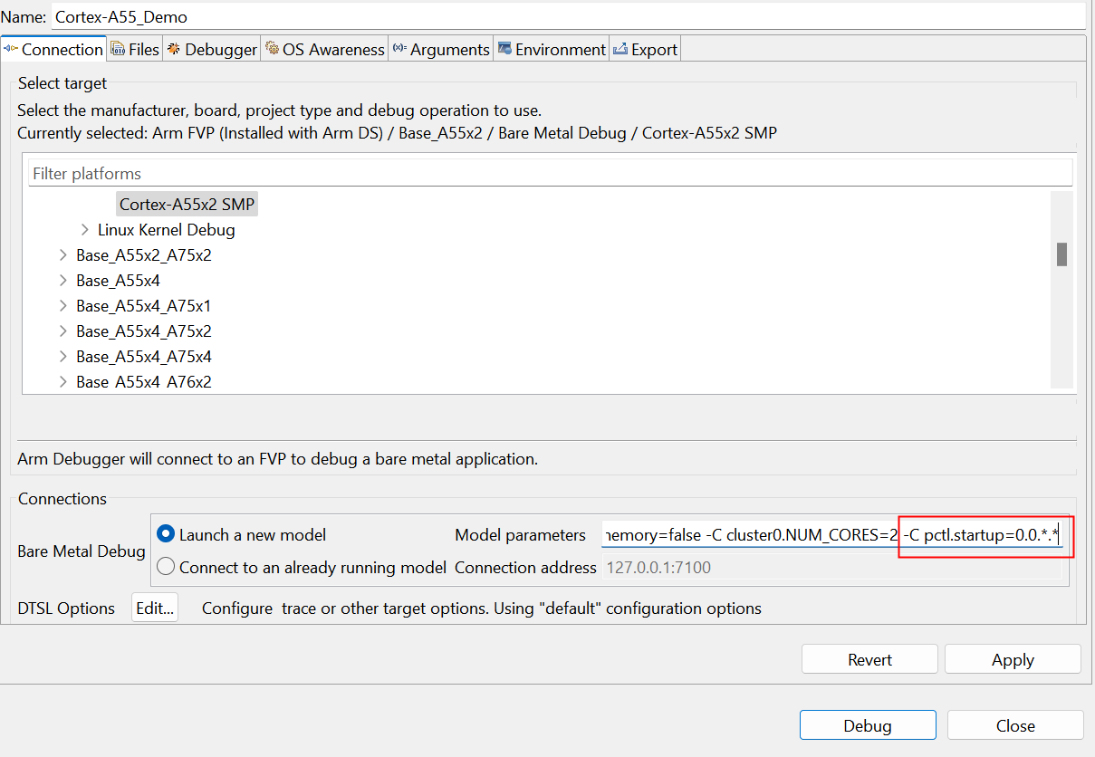1)、打開Cortex-A55的模型的Debug Configuration。