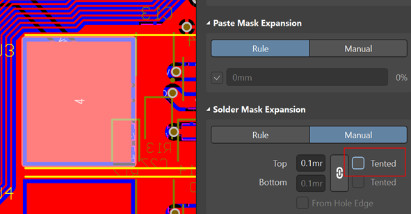 1. 焊盤的屬性中可以設置蓋油或者不蓋油,見圖1,最直接的修改方法,就是去勾選Tented,勾選為蓋油,不勾選則為不蓋油。當發現焊盤被蓋油時,取消勾選Tented就可以去除油。