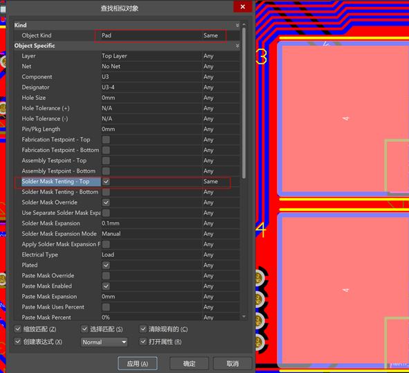 2. 當有復數焊盤需要修改時,可以使用“查找相似對象”來找出被蓋油的焊盤,并集中修改。先選中一個蓋油的焊盤,然后右鍵選擇“查找相似對象”,”Object Kind處為Pad,選擇Same,“Solder Mask Tenting – Top”(以top面焊盤舉例)處打勾,選擇Same,這樣就能批量選中被蓋油的焊盤,然后在屬性中去除Tented打勾即可。