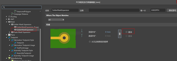 3. 查看一下規則設置中,Soldermask蓋油規則中有沒有誤打勾,如果有,則PCB上所有焊盤會被蓋油,取消打勾即可。