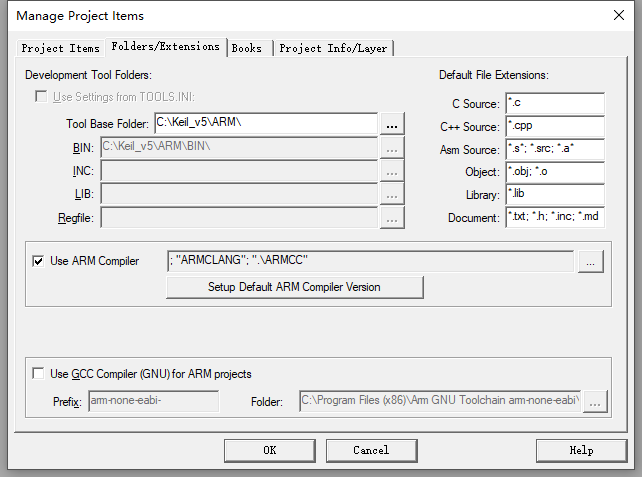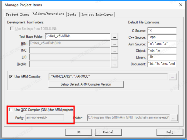 需進(jìn)行如下操作:勾選 GCC 編譯器進(jìn)行使用,點(diǎn)擊 ok,之后重新勾選 ARM 編譯器,點(diǎn)擊 ok。
