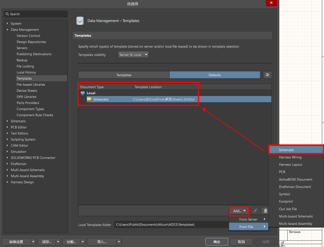 在設置中添加原理圖模版文件 SchDot