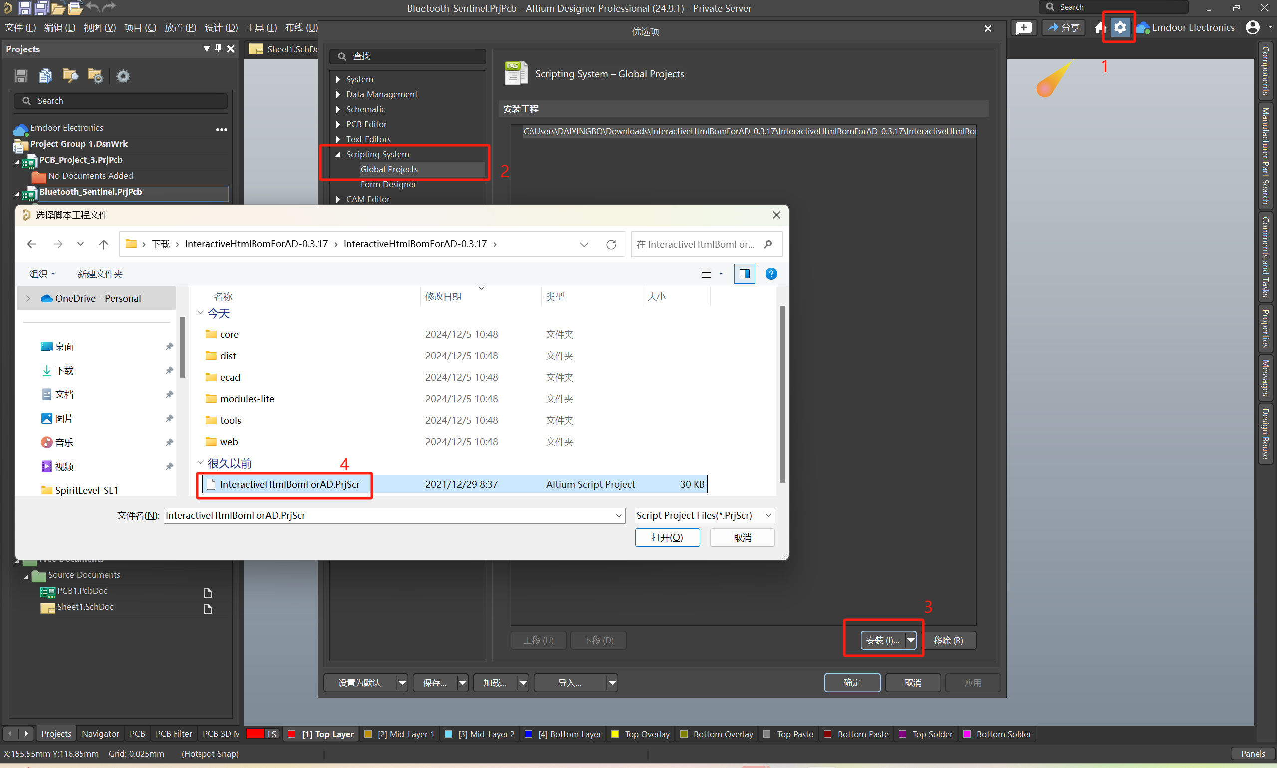 1、解壓附件的腳本文件,打開之后先雙擊運行一次初始化文件”Initialize.bat“,然后打開AD,首先打開設置,側邊欄找到Scripting System->Global Projects,然后選擇從文件安裝,選擇打開插件目錄下的InteractiveHtmlBomForAD.PrjScr文件,點擊安裝并應用。這樣就算是安裝完成了,如圖4-2。