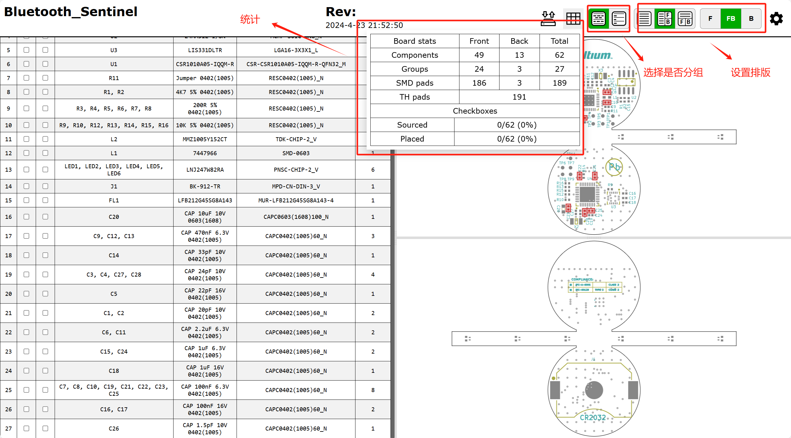 5、這里對應的任務欄可以查看統計的信息,例如焊盤、分組(指的是按照器件的值進行分組)等信息。當然BOM的顯示也可以選擇是否分組,不分組的BOM會把所有的器件拆分開成單獨的一欄,便于觀察選擇單個器件來查看位置,然后是頁面的排版樣式。