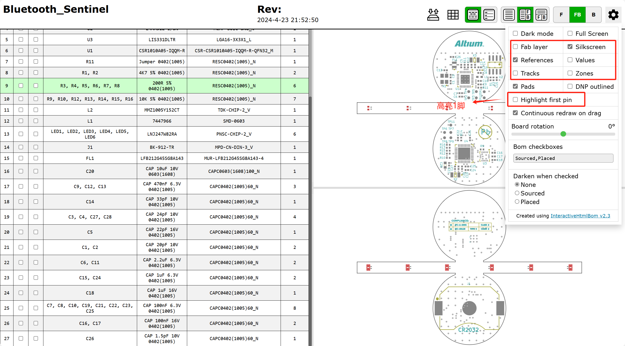 InteractiveHtmlBom可以生成HTML格式的交互式BOM表,鼠標懸停在BOM某欄上,然后對應的位號就高亮,而且功能相當多支持BOM排序,板子絲印設置,高亮設置等等。手工焊接時使用交互式BOM非常方便,可以實現雙向選取及手工標記已焊接的等等功能,而且焊雙面板的時候用交互式BOM也是非常方便的。