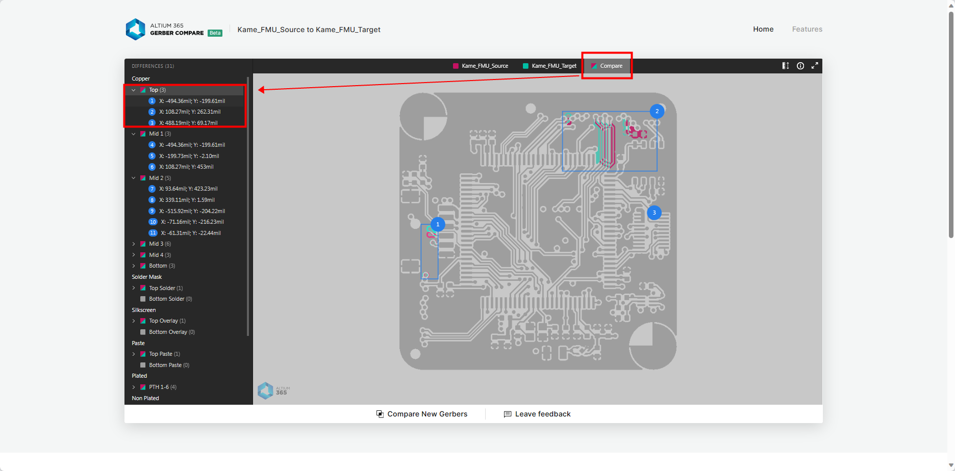 2. 位置數據與交叉探測 :每個差異條目都包含位置數據,指示條目藍色邊界框的左下角位置。并且,交叉探測功能是雙向的。在電路板視圖中選擇數字標記,Compare 窗格中會自動突出顯示其對應的條目;反之,在 Compare 窗格中選擇條目,電路板視圖中也會相應地高亮顯示其圖形等效項。這使得您能夠快速準確地定位和分析差異的具體位置和影響范圍。