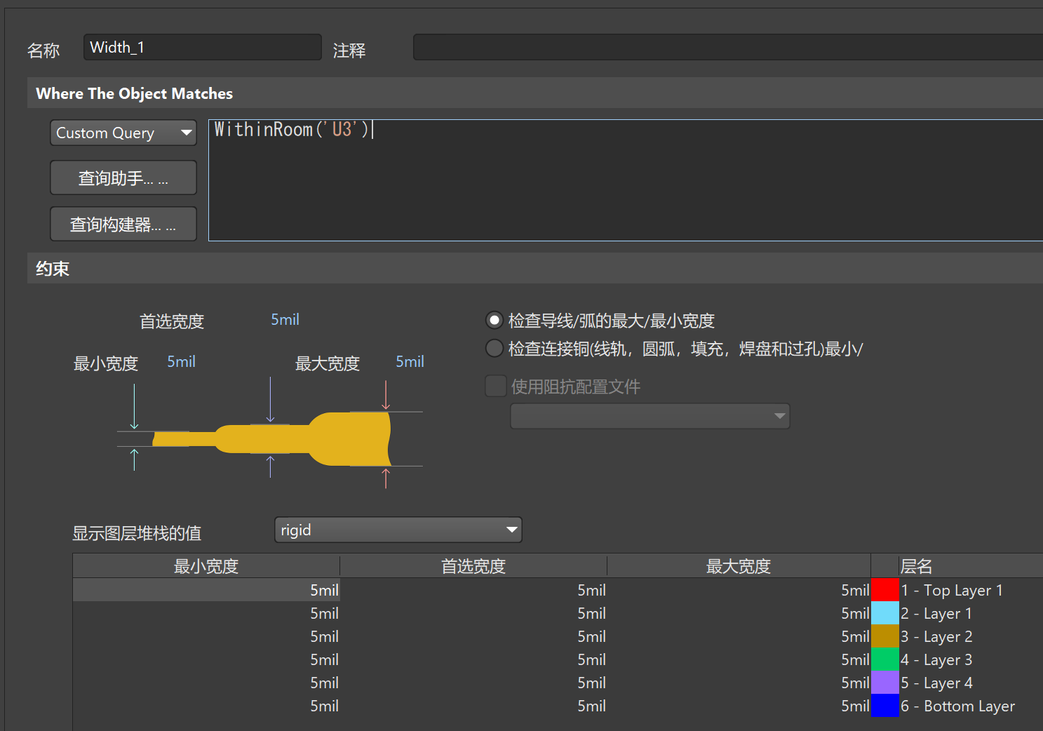 2)、在規(guī)則設(shè)置的線寬中新建一條規(guī)則,輸入條件篩選語句WithinRoom,系統(tǒng)會自動跳出當(dāng)前PCB上有哪些Room,選擇剛才放置的那個,然后設(shè)置線寬。此時,該Room區(qū)域內(nèi),所有線寬將遵循這條規(guī)則,區(qū)域外將遵循其他規(guī)則。