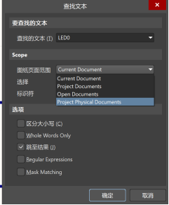 1. 當在原理圖中使用Ctrl+F彈出查找窗口后,默認設置如下圖所示,這時在“查找的文本”框中輸入查找內容,就會彈出報錯框,顯示沒有找到。這是因為在“Scope”的選項不正確。例如,選中了“Selected Objects”,在當前選中的對象中查找,也就是先要選定一些對象,然后再使用查找,就可以在當前選定的對象中找到需要查找的內容。如果沒有選中任何對象,那么就會顯示沒有找到。