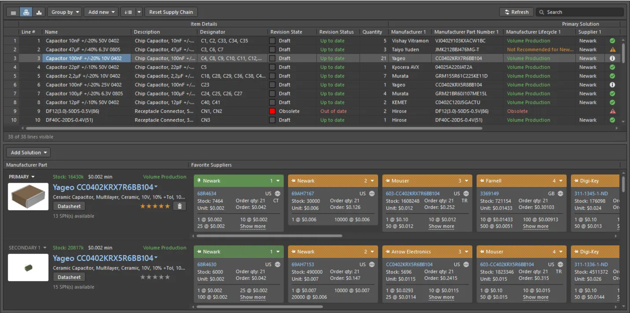 元器件選擇通常是兼顧可用性、單價和制造量的過程。ActiveBOM最大的優勢之一是其能夠將詳細的、最新的供應鏈信息直接帶入設計環境。訪問此信息意味著工程師可輕松監測他們的元器件選擇并根據需要采用元器件。
